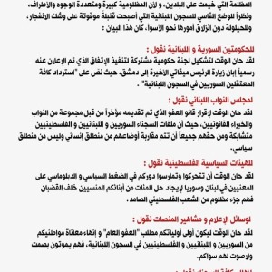طالب المرصد اللبناني لحقوق السجناء، اليوم الحكومة اللبنانية باتخاذ إجراءات عاجلة لحل أزمة السجناء من اللبنانيين والسوريين والفلسطينيين. وجاء في بيان صادر عن المرصد، أنه "بعد تبييض السجون في سوريا وطيّ صفحة الظلم، حان الوقت لفتح صفحة جديدة في لبنان، حيث تغصّ سجونه بآلاف اللبنانيين والسوريين والفلسطينيين، الذين يُعتبرون ضحايا بشكل أو بآخر للوضع الأمني والسياسي والاجتماعي الذي ساد خلال المرحلة المظلمة التي خيّمت على البلدين". ودعا البيان إلى تشكيل لجنة حكومية مشتركة لتنفيذ اتفاق استعادة المعتقلين السوريين من السجون اللبنانية، والذي أُعلن عنه إبان زيارة الرئيس نجيب ميقاتي الأخيرة إلى دمشق.