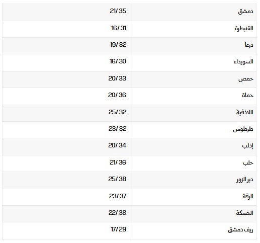 درجات الحرارة الصغرى والعظمى في المحافظات السورية: