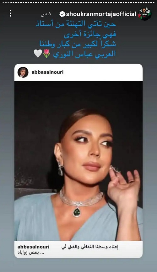 من جانبها، أعادت شكران مرتجى نشر الرسالة عبر خاصية "ستوري" في حسابها على إنستغرام، وعلّقت: "حين تأتي التهنئة من أستاذ فهي جائزة أخرى.. شكراً لكبير من كبار وطننا العربي عباس النوري".