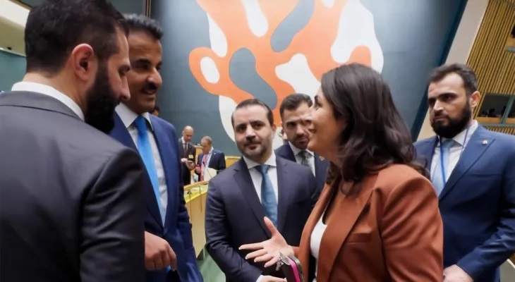 على هامش اجتماعات الجمعية العامة للأمم المتحدة، تشهد أروقة المنظمة الدولية العديد من اللقاءات الجانبية بين قادة الدول المشاركة، حيث تتبادل الوفود الحوار وتناقش القضايا الإقليمية والدولية بعيدا عن أعين وسائل الإعلام وعدسات الصحفيين. وفي مشهد لافت خلال هذه الاجتماعات، كان أمير دولة قطر الشيخ تميم بن حمد آل ثاني والرئيس السوري أحمد الشرع في حديث جانبي، حين تقدمت إليهما الصحفية الألمانية ذات الأصول الكردية، دوزين تكال، محاولة اقتناص فرصة لطرح سؤال على الرئيس السوري. ففوجئت الصحفية بتدخل سريع ولبق من أمير قطر، الذي قاطعها بلطف، كما انتبه وزير الخارجية السوري أسعد الشيباني للحوار ويغمز الرئيس الشرع، في إيماءة فسّرت بأنها رسالة بعدم الإدلاء بأي تصريح للصحفية في ذلك الموقف الحساس.