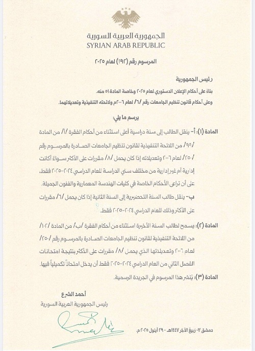 أعلنت الرئاسة السورية، مرسوما يمنح ترفعا إداريا لطلاب الجامعات السورية، على أن تُراعى الأحكام الخاصة في كليات الهندسة المعمارية والفنون الجميلة. ويحمل المرسوم الرئاسي "الرقم (192) لعام 2025، ويقضي بمنح ترفع إداري لطلاب الجامعات في الجمهورية العربية السورية".