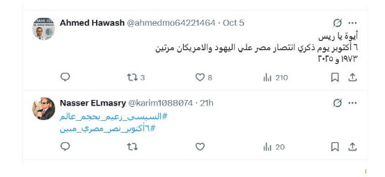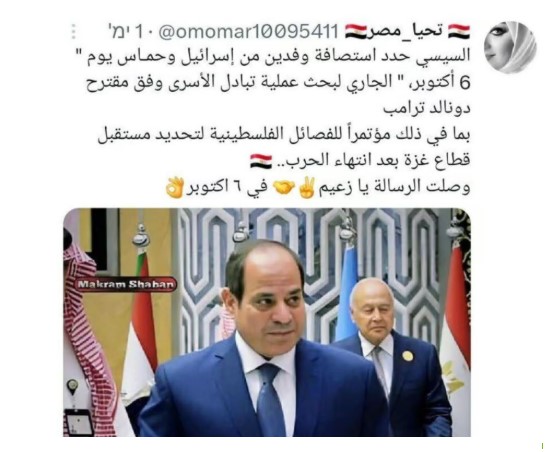 وأشارت الصحيفة العبرية إلى أن منصات التواصل الاجتماعي في مصر ربطت بين موعد المفاوضات في شرم الشيخ وأحداث نصر السادس من أكتوبر، ووصفت ذلك بأنه "جزء من الاحتفالات". وتحتفل مصر بالذكرى الثانية والخمسين للهجوم المفاجئ الذي أشعل فتيل حرب أكتوبر، في الوقت الذي من المقرر أن تبدأ فيه محادثات إنهاء الحرب في قطاع غزة ظهرًا في شرم الشيخ. واعتبر رواد مواقع التواصل الاجتماعي المصرية هذا التزامن "إهانة رمزية" لإسرائيل، واقترحوا، من بين أمور أخرى، تحديد موعد بدء الاجتماع مع "ساعة الصفر" التي انطلقت فيها حرب أكتوبر، أو دعوة الوفد الإسرائيلي لزيارة سيناء ضمن فعاليات الاحتفالات الوطنية.