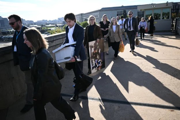 سلم عشرات الصحفيين بطاقات الدخول وغادروا مبنى وزارة الحرب الأميركية (البنتاغون)، بدلا من الموافقة على القيود التي فرضتها الإدارة الأميركية على عملهم. وتوحدت أغلب وسائل الإعلام في رفضها القواعد الجديدة التي فرضها وزير الحرب بيت هيغسيث، والتي ستجعل الصحفيين عرضة للطرد إذا حاولوا الإبلاغ عن معلومات لم يوافق هيغسيث على نشرها. وغادر الصحفيون عند الرابعة مساء بالتوقيت المحلي، الموعد النهائي الذي حددته وزارة الحرب للموافقة على القيود الجديدة أو مغادرة المبنى، وترك نحو 40 صحفيا المكاتب المخصصة لوسائل الإعلام شبه مهجورة بعد أن حملوا معهم في طريق المغادرة صناديق الوثائق والتجهيزات الخاصة بهم. وقالت مراسلة مجلة أتلانتيك التي عملت في البنتاغون منذ عام 2007 نانسي يوسف "إنه أمر محزن، لكنني فخورة جدا بفريق الصحفيين لأننا تمسكنا ببعضنا بعضا"، وكانت تتحدث وهي تحمل خريطة للشرق الأوسط إلى سيارتها. ومن غير الواضح مدى التأثير العملي للقواعد الجديدة على التغطية الإعلامية. وتعهدت المؤسسات الإعلامية المعنية بالاحتجاج بمواصلة تغطية الشؤون العسكرية بغض النظر عن مكان وجود صحفييها. وقال بعض الصحفيين إن مصادرهم ستستمر في التحدث إليهم، على الرغم من أن البعض في الجيش يشعر بالقلق بسبب تهديدات القيادة في البنتاغون.