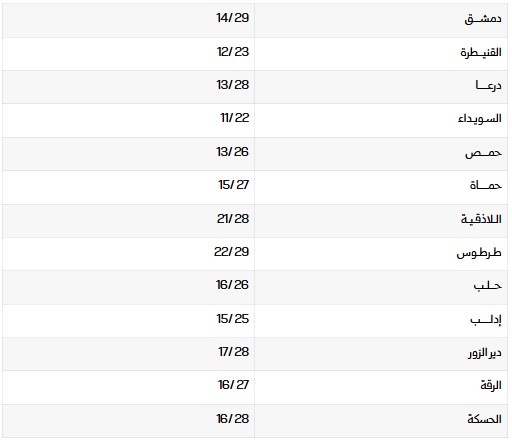 درجات الحرارة الصغرى والعظمى في المحافظات: