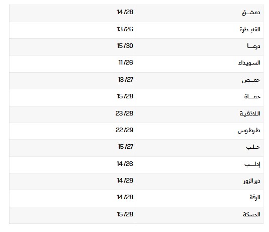 درجات الحرارة الصغرى والعظمى في المحافظات: