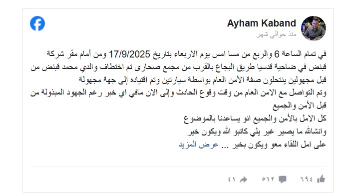 وأشار إلى أن العملية نُفذت باستخدام سيارتين، جرى خلالهما اقتياد والده إلى جهة مجهولة، لافتاً إلى أن العائلة تواصلت مع الأجهزة الأمنية منذ اللحظة الأولى دون التوصل إلى أي معلومات مؤكدة حتى الآن.