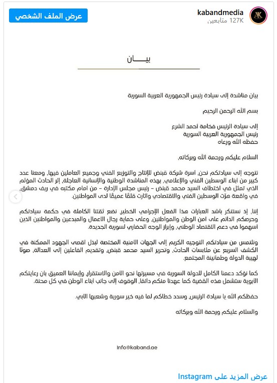 دعت شركة قبنض للإنتاج الفني الرئاسة السورية إلى التدخل العاجل للكشف عن مصير رئيس مجلس إدارتها محمد قبنض بعد اختطافه في ريف دمشق، معربة عن ثقتها بقدرة الجهات الرسمية والأمنية على تتبع الجناة والوصول إلى الحقيقة في أقرب وقت. وقالت الشركة في بيان رسمي إن ما حدث "حادثة مؤلمة هزت أوساط الفن والاقتصاد"، مشيرة إلى أن محمد قبنض كان من أبرز الداعمين للحركة الدرامية والاقتصادية في سوريا خلال السنوات الماضية.