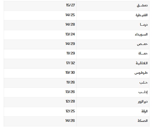 درجات الحرارة الصغرى والعظمى المتوقعة في المحافظات: