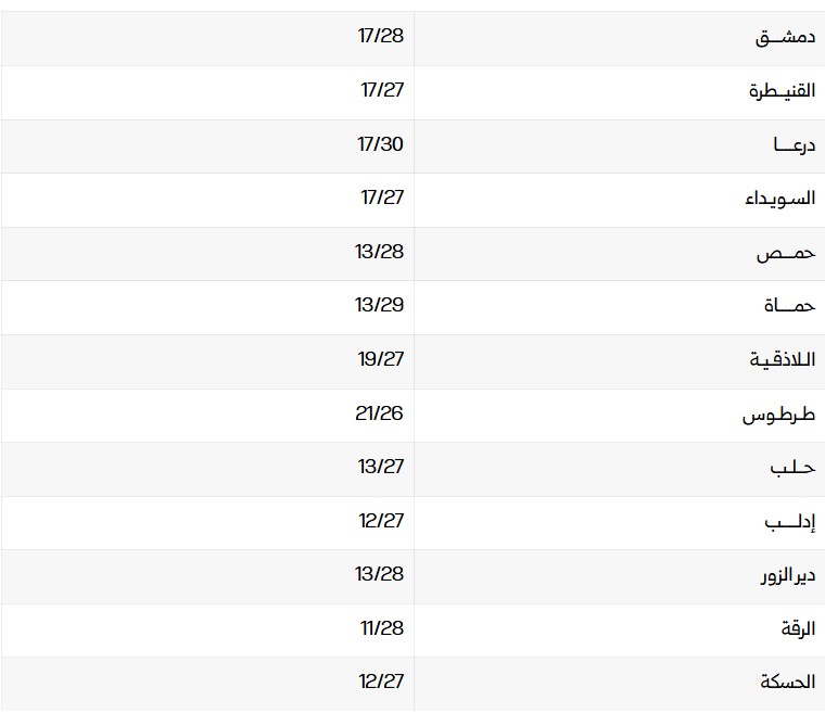 درجات الحرارة المتوقعة في المحافظات السورية..