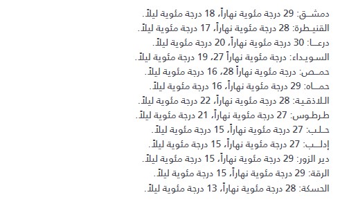 وسيكون البحر خفيف ارتفاع الموج، وتكون الرياح متقلبة الاتجاه وخفيفة السرعة عموماً، مع نشاطها في المناطق الجنوبية والشرقية بسرعات تصل الى 25 كم/ساعة، مترافقة مع هبّات نشطة إلى قوية تتراوح بين 45 و55 كم/ساعة.