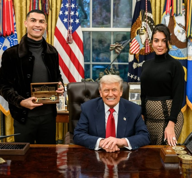 وشهد المكتب البيضاوي في البيت الأبيض لحظة استثنائية جمعت بين السياسة والرياضة والتكنولوجيا، حيث ظهر النجم البرتغالي كريستيانو رونالدو ممسكا بمفتاح البيت الأبيض. ورحب الرئيس الأمريكي دونالد ترامب، أثناء مأدبة العشاء، بالنجم البرتغالي، مؤكدا أن حضوره يمثل شرفا كبيرا له، وقال بابتسامة: “ابني بارون من أشد المعجبين برونالدو، ويبدو أنه يحترمني أكثر الآن بعد أن قدمته إليه”. وأضاف الرئيس الأمريكي: "أشكرك على حضورك، إنه شرف كبير لي". ونشر رونالدو عبر حساباته على منصات التواصل الاجتماعي عدة صوره له ولشريكته جورجينا مع دونالد ترامب في البيت الأبيض. وكتب رونالدو في منشوره قائلا: "شكراً سيدي الرئيس على دعوتك وعلى الترحيب الحار الذي قدمته لي ولزوجتي المستقبلية جورجينا رودريغيز، أنت والسيدة الأولى. لكل منا قيمة نقدمها، وأنا على أتم الاستعداد للقيام بدوري في إلهام الأجيال الجديدة لبناء مستقبل قوامه الشجاعة والمسؤولية والسلام الدائم".