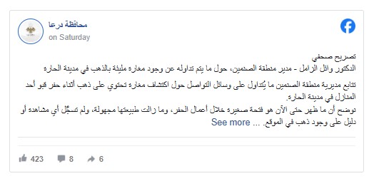 وفي سياق متصل، أصدرت محافظة درعا بيانا عبر صفحتها الرسمية على "فيسبوك"، جاء فيه على لسان وائل الزامل، مدير منطقة الصنمين، وجهاد قويدر، مدير السياحة في درعا، نفي قاطع للأخبار المتداولة، مؤكدين أن ما يجري الحديث عنه مجرد إشاعة ولا أساس لها من الصحة، وداعين الأهالي إلى تجنّب التهويل والتجمع في المكان.