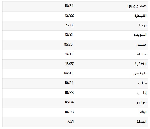 درجات الحرارة العظمى والصغرى المتوقعة في المحافظات: