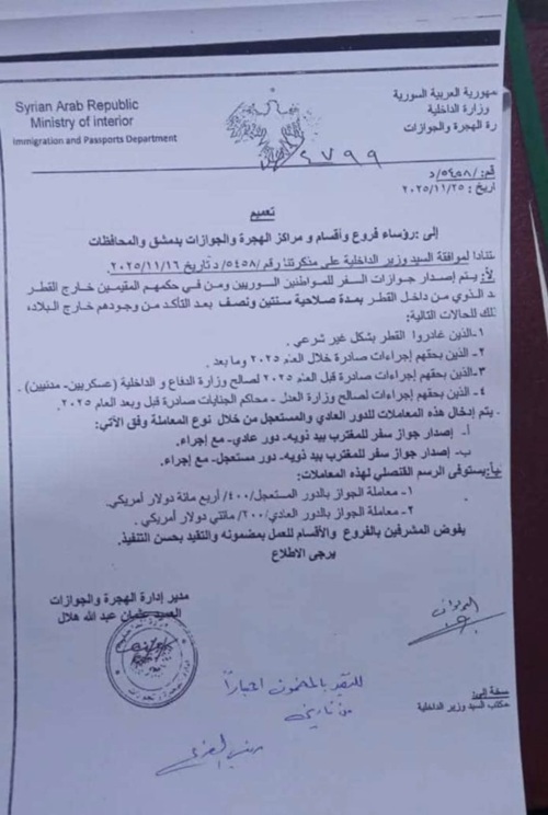 وكلّف التعميم المشرفين في فروع وأقسام الهجرة والجوازات في دمشق والمحافظات بالعمل بموجبه وضمان التنفيذ وفق الإجراءات المحددة.