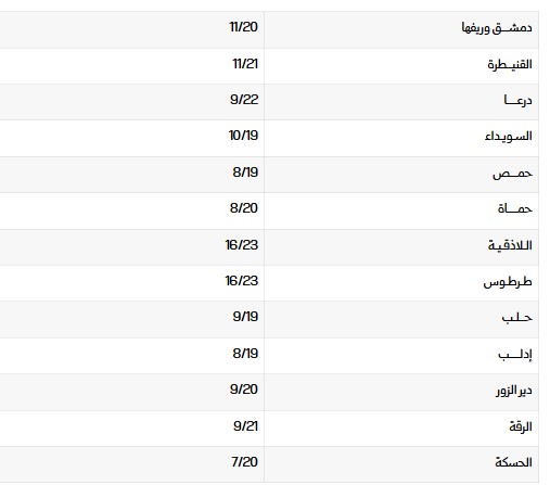 تكون درجات الحرارة اليوم أعلى من معدلاتها بقليل، لمثل هذه الفترة من السنة في مختلف المناطق السورية. وتوقعت المديرية العامة للأرصاد الجوية، أن يكون الطقس خريفياً مستقراً، مع انتشار للسحب غير الممطرة، لتكون الأجواء غائمة جزئياً بصورة عامة على كل المناطق. وتتحرك الرياح بصورة شرقية متقلبة تتراوح سرعتها ما بين 10 و20 كم/ساعة، وتترافق بهبات نشطة نسبياً إلى نشطة تتراوح ما بين 25 و35 كم/ساعة، وتبلغ ذروة نشاطها في المناطق الساحلية، مع هبات تصل حتى 50 كم/ساعة، ويكون البحر خفيف ارتفاع الموج.