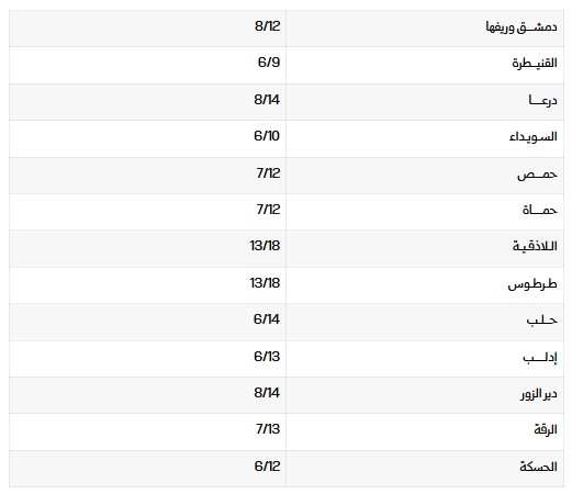 درجات الحرارة الصغرى والعظمى في المحافظات: