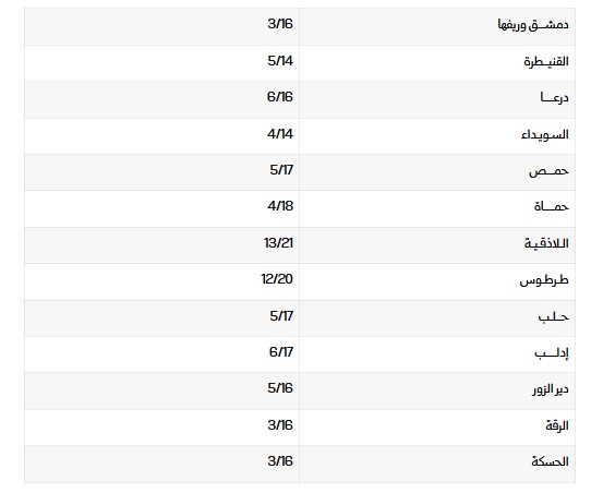 درجات الحرارة العظمى والصغرى في المحافظات: