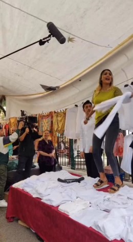 وبينت الممثلة السورية أن الحماس الكبير في أثناء التصوير وصل إلى حد أنها كادت تفقد صوتها في بعض اللقطات، لا سيما خلال مشاهد بيع القمصان وسط الزحام والحركة.