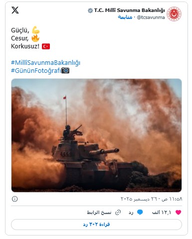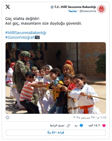 ولم يطل الانتظار قبل أن ترد وزارة الدفاع التركية بتدوينة ثالثة، نشرت فيها صورة جديدة، هذه المرة دون سلاح أو دبابة، بل صورة رمزية تعكس رؤية فلسفية مختلفة، مرفقة بتعليق قال: "القوة ليست بالسلاح..القوة الحقيقية تكمن في الثقة التي يوليها لك الأبرياء."