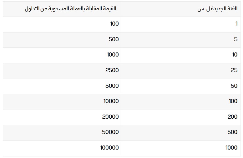 المادة (5): تُحدد فئات العملة السورية الجديدة وقيمتها المقابلة من العملة السورية القديمة وفق الجدول الآتي: