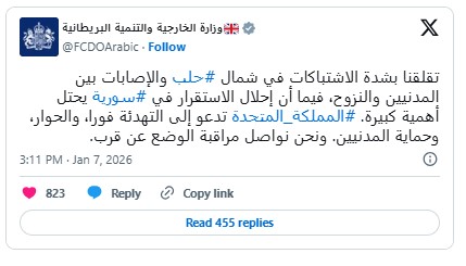 الخارجية البريطانية تدعو إلى الحوار والتهدئة بعد اشتباكات شمالي حلب