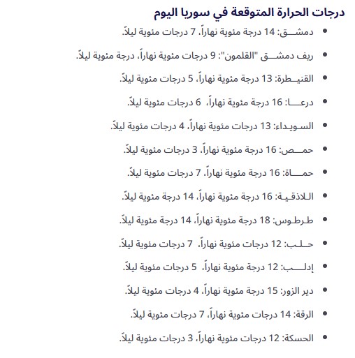 كما توقعت تشكل الضباب في أجزاء من إدلب وحلب وشمالي حماة، إلى جانب مناطق من ريف دمشق الشمالي والقنيطرة وشمال شرقي الحسكة. وأشارت المديرية إلى أن الأجواء اليوم نهاراً ستكون غائمة ماطرة على الساحل، مع هطولات غزيرة تترافق بعواصف رعدية وتساقط للبرد، في حين تكون الأمطار متوسطة الغزارة وقد تشتد أحياناً على إدلب وحلب والمناطق الغربية والشمالية من حماة وغربي حمص، وتمتد لتشمل الأجزاء الشمالية من الرقة والحسكة.