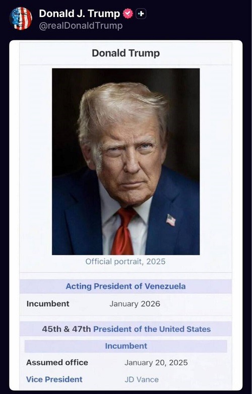 وفي تطور لافت، نشر ترامب صورة له من ويكيبيديا تحت عنوان "رئيس فنزويلا بالوكالة"، ملمحا بسخرية إلى شرعية ديلسي رودريغير، نائبة الرئيس نيكولاس مادورو، والتي تولت زمام السلطة بعد اعتقاله في 3 يناير على يد قوة أمريكية خاصة.