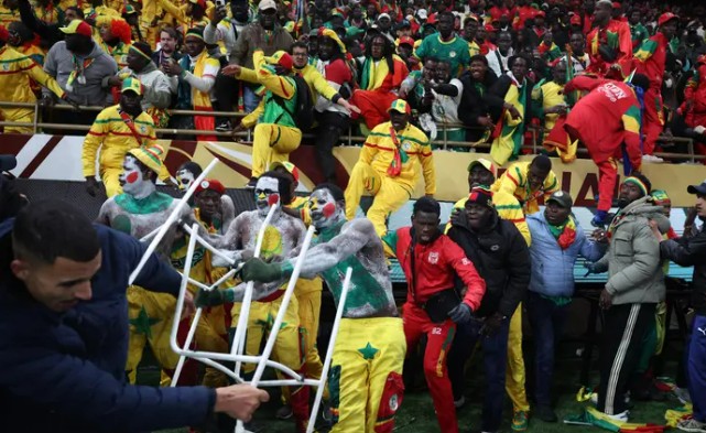 وعبر مكبّر الصوت، وجّه المذيع الداخلي نداءً بالفرنسية ثم بالإنجليزية: نرجو من المشجعين الحفاظ على هدوئهم حتى نتمكن من استئناف المباراة. وفي المنصة المخصّصة للإعلام، اندلعت اشتباكات بالأيدي بين ممثلين لوسائل إعلام مغربية وسنغالية، وفق ما لاحظه صحافيو وكالة "فرانس برس". وفي ظل هذه الفوضى الهائلة، سدد إبراهيم دياز ركلة الجزاء، لكن هداف البطولة (خمسة أهداف) أخفق تماماً في محاولته الضعيفة. وقد انقلبت المباراة على احتجاج سيُسجل بالتأكيد في تاريخ كأس أفريقيا.