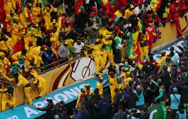 شوهد ماني، بطل لقب 2022 وصاحب هدف الفوز في نصف النهائي على مصر (1-0)، وهو يركض لإعادة زملائه الذين كانوا قد دخلوا بالفعل النفق المؤدي إلى غرف الملابس. وأقامت قوات الأمن حاجزاً أسفل المدرج الأخضر والأصفر والأحمر المخصص لمشجعي "الأسود"، مجموعة "الدوزييم غينديه" الشهيرة (غينديه تعني أسداً بالولوف)، وقد طُليت أجساد بعضهم بألوان العلم الوطني. وأُلقيت كراسٍ على أرض الملعب، وحاول بعض المشجعين اقتحام المستطيل.