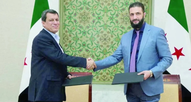 وأعلنت الرئاسة السورية، اتفاقا لوقف إطلاق نار مع قسد يضمن دمج عناصرها ودخول الدولة إلى الرقة ودير الزور والحسكة. وقد وقّع الرئيس السوري اتفاقا لوقف إطلاق النار مع قسد. وقال الشرع إن الاتفاق يشمل الاندماج الكامل لقوات قسد في الجيش ودخول مؤسسات الدولة إلى محافظات الشمال والشمال الشرقي، في إشارة إلى الرقة ودير الزور والحسكة. ودعا الشرع قوات العشائر إلى فتح المجال لتطبيق الاتفاق. يذكر أن اللقاء بين الرئيس السوري وقائد قوات قسد تأجّل، حيث أوضح الرئيس السوري أن عبدي تعذر وصوله إلى دمشق بسبب سوء الأحوال الجوية. وردا على سؤال بشأن المدى الزمني لتنفيذ الاتفاق ومصير اتفاق العاشر من مارس/آذار العام الماضي، أكد الرئيس الشرع أن الاتفاق الحالي هو من روح اتفاق العاشر من مارس/آذار. وكان الرئيس السوري قد التقى في وقت سابق المبعوث الأميركي الخاص إلى سوريا توم برّاك في العاصمة دمشق. وأشارت الرئاسة السورية إلى أن الرئيس الشرع أكد خلال اللقاء، على سيادة سوريا على كامل أراضيها، وأهمية الحوار في المرحلة الراهنة، وبناء سوريا بمشاركة جميع السوريين، إلى جانب مواصلة تنسيق الجهود في مكافحة الإرهاب.