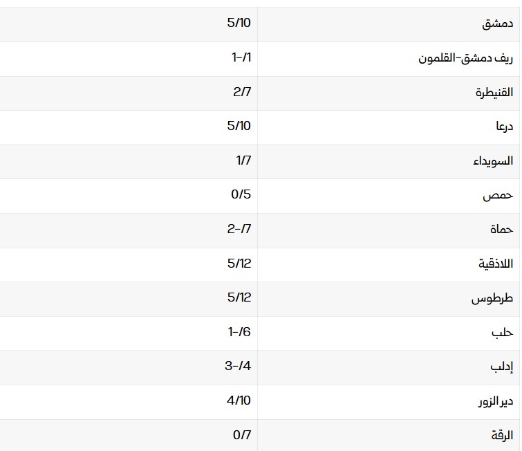 درجات الحرارة العظمى والصغرى في المحافظات السورية: