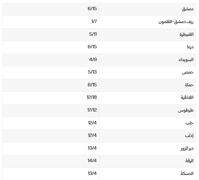 درجات الحرارة العظمى والصغرى المتوقعة في بعض المحافظات السورية: