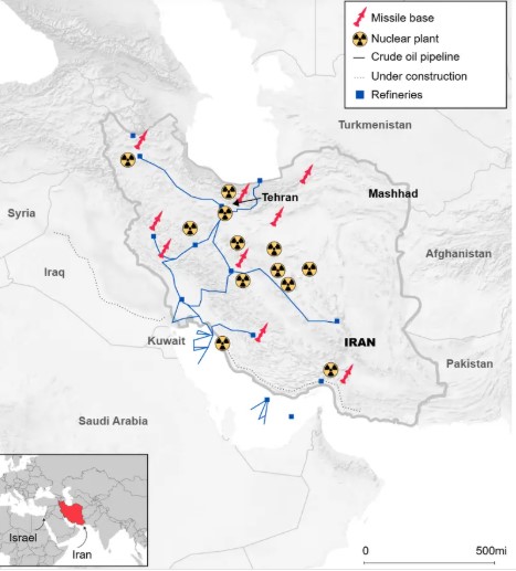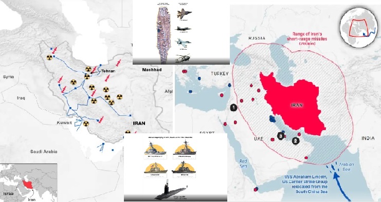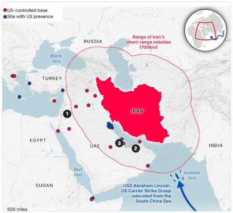 أما "أسوشييتد برس" فأفادت برصد تحركات عشرات الطائرات العسكرية الأميركية نحو المنطقة، في وقت يرجح أن وصول حاملة الطائرات رفع عدد القوات الأميركية ليقارب الإجمالي 50 ألفا، ما يجعل المرحلة المقبلة مفتوحة على كل الاحتمالات، من التصعيد العسكري إلى فرض تسوية تحت ضغط القوة. بدورها، نشرت "ديلي ميل" صورة للمواقع النووية والقواعد العسكرية ومحطات النفط التي قد تستهدفها أميركا.