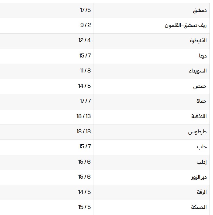 درجات الحرارة العظمى والصغرى المتوقعة في المحافظات: