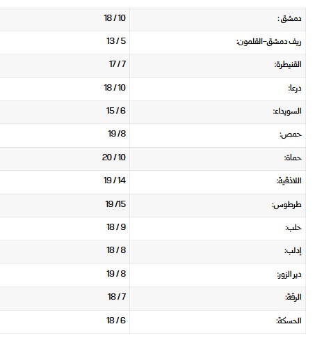 درجات الحرارة العظمى والصغرى المتوقعة في المحافظات السورية: