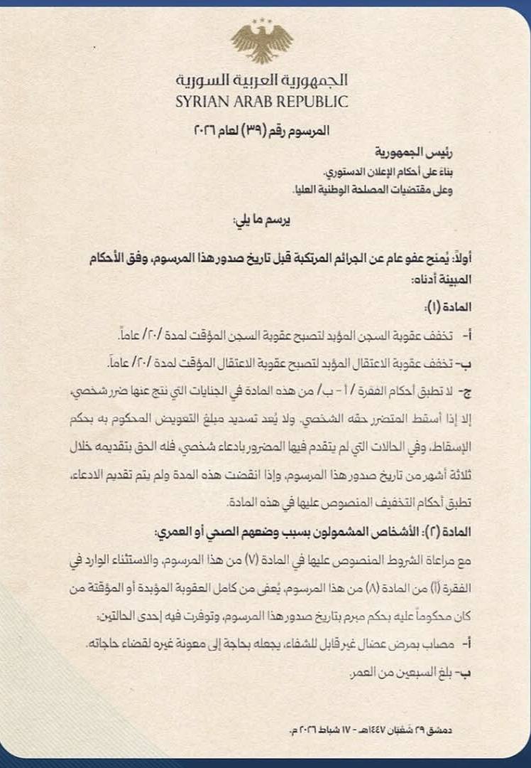 أصدر الرئيس السوري أحمد الشرع، اليوم الأربعاء، المرسوم رقم (39) لعام 2026، القاضي بمنح عفو عام عن الجرائم المرتكبة قبل تاريخ صدوره، وذلك وفق أحكام وشروط محددة نصّ عليها المرسوم، مع استثناء عدد من الجرائم الواردة فيه. ونصّ المرسوم في مادته الأولى على منح عفو عام عن الجرائم المرتكبة قبل تاريخ صدوره، حيث تُخفَّض عقوبة السجن المؤبد لتصبح السجن المؤقت لمدة /20/ عاماً، كما تُخفَّض عقوبة الاعتقال المؤبد لتصبح الاعتقال المؤقت لمدة /20/ عاماً. واستثنت الفقرة (ج) من المادة ذاتها الجنايات التي نتج عنها ضرر شخصي، إلا إذا أسقط المتضرر حقه الشخصي، ولا يُعدّ تسديد مبلغ التعويض المحكوم به بمثابة إسقاط للحق الشخصي. وفي الحالات التي لم يُقم فيها المتضرر دعوى شخصية، مُنح مهلة ثلاثة أشهر من تاريخ صدور المرسوم لتقديم الادعاء، وإلا تُطبَّق أحكام التخفيض. كما أعفت المادة الثانية، مع مراعاة الشروط المنصوص عليها في المادة (7) والاستثناءات الواردة في الفقرة (أ) من المادة (8)، من كامل العقوبة المؤبدة أو المؤقتة المحكوم بها بموجب حكم مبرم، إذا كان المحكوم عليه بتاريخ صدور المرسوم مصاباً بمرض عضال غير قابل للشفاء يجعله بحاجة إلى معونة غيره لقضاء حاجاته، أو إذا بلغ السبعين من العمر.
