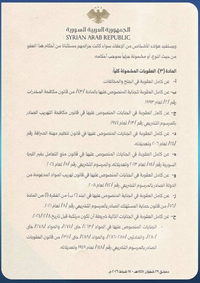 وبيّن المرسوم العقوبات المشمولة كلياً بالعفو، وتشمل كامل العقوبة في الجنح والمخالفات، وكامل العقوبة في الجناية المنصوص عليها في المادة /43/ من قانون مكافحة المخدرات رقم /2/ لعام 1993، وكامل العقوبة في جنايات التهريب المنصوص عليها في قانون مكافحة التهريب الصادر بالمرسوم التشريعي رقم /13/ لعام 1974، وكامل العقوبة في جنايات قانون تنظيم مهنة الصرافة رقم /24/ لعام 2006 وتعديلاته، وكذلك في جنايات قانون منع التعامل بغير الليرة السورية رقم /54/ لعام 2013 وتعديلاته، والمرسوم التشريعي رقم /5/ لعام 2024، وجنايات قانون تهريب المواد المدعومة من الدولة الصادر بالمرسوم التشريعي رقم /3/ لعام 2020، إضافة إلى كامل العقوبة في الجناية المنصوص عليها في البند (ب) من الفقرة (أ) من المادة /15/ من قانون حماية المستهلك الصادر بالمرسوم التشريعي رقم /8/ لعام 2021. وشمل العفو، بشرط أن تكون الجناية مرتكبة قبل تاريخ 8/3/2024، الجنايات المنصوص عليها في المواد /263/ حتى /277/، والمادة /280/، والمادتين /285/ و/286/، والمواد /288/ حتى /311/ من قانون العقوبات الصادر بالمرسوم التشريعي رقم /148/ لعام 1949 وتعديلاته.