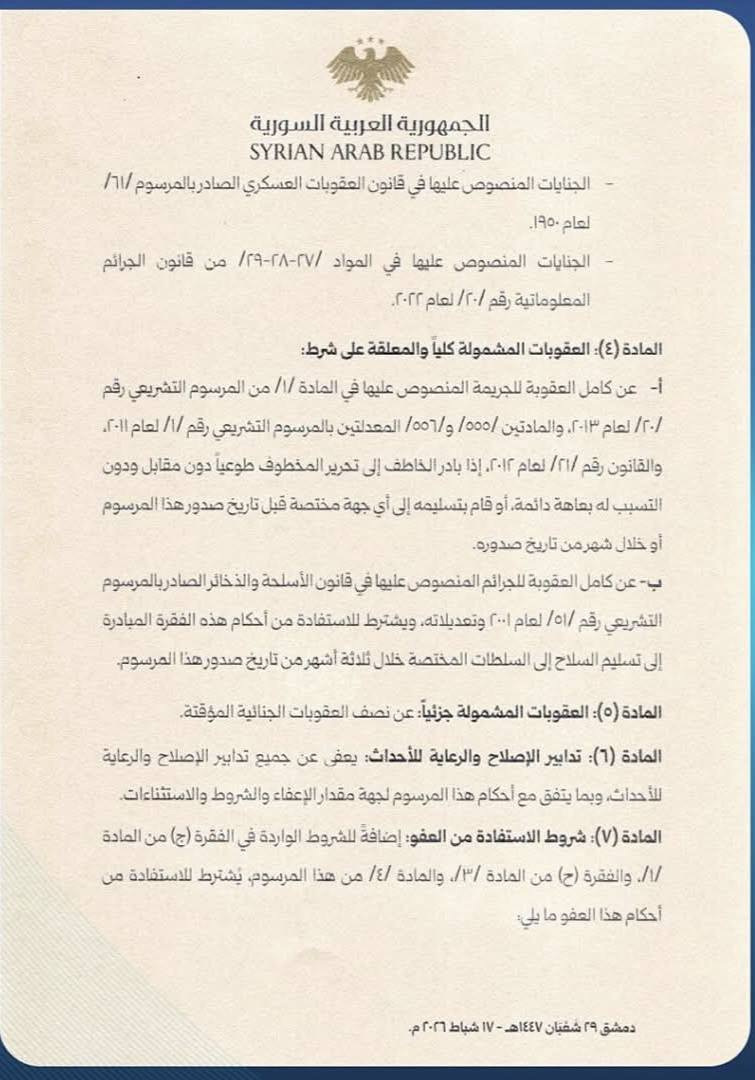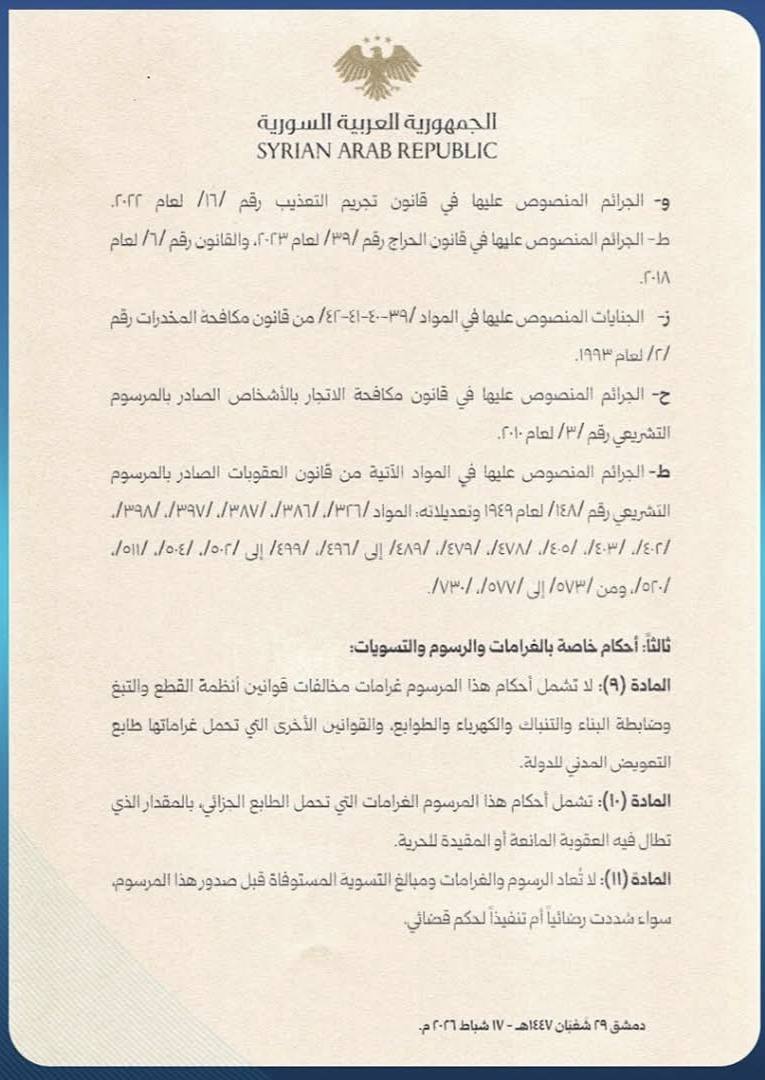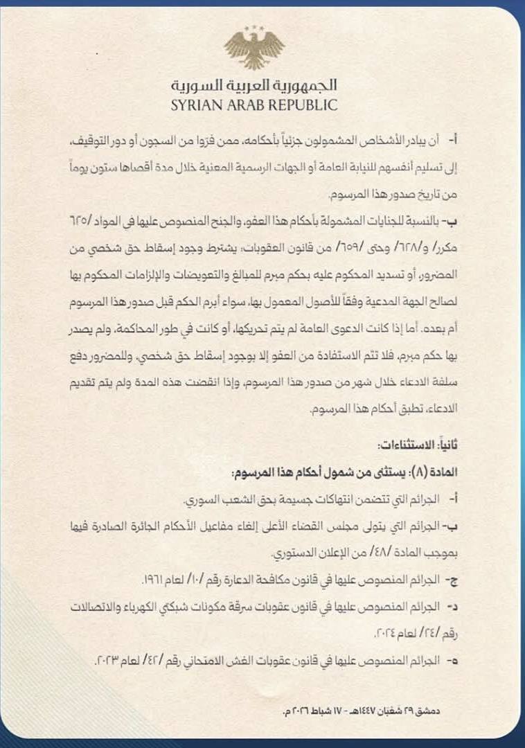 وفيما يتصل بالاستثناءات، استثنى المرسوم من أحكامه الجرائم التي تتضمن انتهاكات جسيمة بحق الشعب السوري، والجرائم التي يتولى مجلس القضاء الأعلى إلغاء مفاعيل الأحكام الجزائية الصادرة فيها بموجب المادة /47/ من الإعلان الدستوري، والجرائم المنصوص عليها في قانون مكافحة الدعارة رقم /10/ لعام 1961، والجرائم المنصوص عليها في قانون عقوبات سرقة مكونات شبكتي الكهرباء والاتصالات رقم /24/ لعام 2022، والجرائم المنصوص عليها في قانون عقوبات الغش الامتحاني رقم /42/ لعام 2023، والجنايات المنصوص عليها في قانون العقوبات العسكري الصادر بالمرسوم رقم /61/ لعام 1950، إضافة إلى الجنايات المنصوص عليها في المواد /27/ و/28/ و/29/ من قانون الجرائم المعلوماتية رقم /20/ لعام 2022. كما استثنى الجرائم المنصوص عليها في قانون تجريم التعذيب رقم /16/ لعام 2022، والجرائم المنصوص عليها في قانون الحراج رقم /39/ لعام 2023، والقانون رقم /6/ لعام 2018، والجنايات المنصوص عليها في المواد /39/ و/40/ و/41/ و/42/ من قانون مكافحة المخدرات رقم /2/ لعام 1993، والجرائم المنصوص عليها في قانون مكافحة الاتجار بالأشخاص الصادر بالمرسوم التشريعي رقم /3/ لعام 2010، والجرائم المنصوص عليها في المواد المحددة من قانون العقوبات الصادر بالمرسوم التشريعي رقم /148/ لعام 1949 وتعديلاته. وبيّن المرسوم في أحكامه الإجرائية أن وزير العدل يُشكّل اللجان الطبية اللازمة لفحص طالبي الاستفادة من أحكامه، وتعمل هذه اللجان تحت إشراف النيابة العامة، على أن يُقدَّم طلب الاستفادة إلى ديوان النيابة العامة مباشرة أو عن طريق إدارة السجن، خلال مهلة أقصاها شهران من تاريخ صدور المرسوم، وإلا سقط الحق في الاستفادة. وخُتم المرسوم بالنص على نشره في الجريدة الرسمية، ويُعدّ نافذاً من تاريخ صدوره في دمشق بتاريخ 29 شعبان 1447 هجري، الموافق 17 شباط 2026.