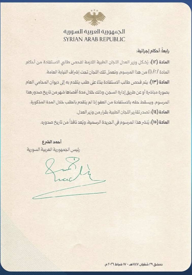الرئيس الشرع يصدر المرسوم رقم (39) للعام 2026 القاضي بمنح عفو عام