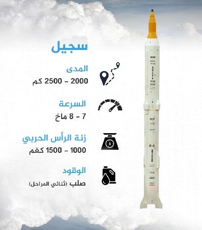 أعلنت إيران، أنها استهدفت إسرائيل للمرة الأولى بصواريخ "سجيل" التي وصفتها بأنها إستراتيجية. وقال الحرس الثوري الإيراني في بيان، إنه نفذ بنجاح هجمات على مراكز قيادة العمليات الجوية الإسرائيلية ومراكز صنع القرار، وبنية تحتية فعّالة في الصناعات العسكرية والدفاعية، ونقاط تجمع للقوات العسكرية، باستخدام صواريخ سجيل الإستراتيجية. وأوضح البيان أن استخدام صواريخ سجيل -التي تعمل بالوقود الصلب- جاء في إطار الموجة الرابعة والخمسين من عملية "الوعد الصادق". ووفقا لوكالة أنباء الطلبة الإيرانية شبه الرسمية فإن صاروخ سجيل هو أحدث صاروخ باليستي إيراني، وهو قادر على التحليق بسرعة تتجاوز 17 ألف كيلومتر في الساعة، ويبلغ مداه 2500 كيلومتر.