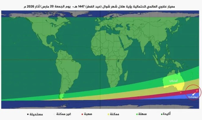 لكن الغريب، كما يضيف علاوي، أن نيوزيلندا وبعض الجزر القريبة منها لن تتمكن من رؤية الهلال في يوم الجمعة، الذي قد يكون أول أيام عيد الفطر في مناطقنا، إذ كما توضح الخريطة، فإن نيوزيلندا تقع في المنطقة التي يكون الهلال فيها صعبا وغير ممكن الرؤية. وإن أكملوا عدة رمضان 30، فسيكون العيد عندهم يوم الأحد 22 مارس/آذار.