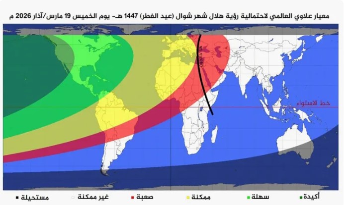 وتُظهر الخريطة، كما يقول علاوي، أن معظم العالم العربي يقع يوم الخميس ضمن مناطق اللون الأحمر أو الأصفر، أي أن رؤية الهلال ستكون ممكنة بالتلسكوبات أو بالعين المجردة في ظروف جوية مثالية.