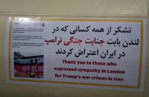 وأعرب ملصق آخر عن امتنان الإيرانيين للمشاركين في مظاهرة نظمت في لندن تعاطفا مع ضحايا جرائم الحرب الأمريكية الإسرائيلية على إيران.