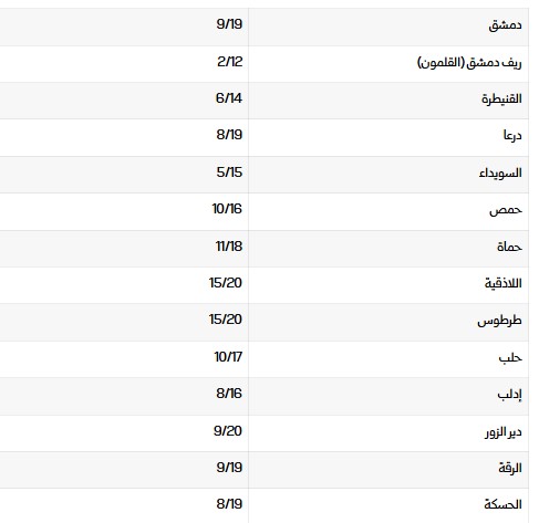 درجات الحرارة العظمى والصغرى في المحافظات السورية: