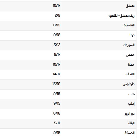 درجات الحرارة العظمى والصغرى في المحافظات السورية: