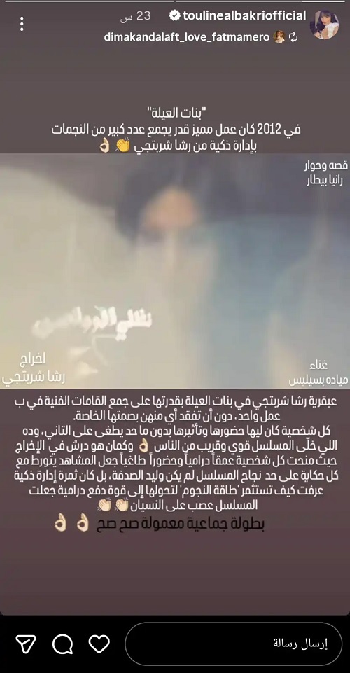 شاركت تولين البكري من خلال "ستوري" عبر حسابها على منصة "إنستغرام" فيديو شارة مسلسل "بنات العيلة"، مرفقاً بتعليق مطوّل أشادت فيه بإدارة رشا شربتجي للعمل وقدرتها على جمع عدد كبير من النجمات ضمن بطولة جماعية متوازنة، مؤكدة أن كل شخصية امتلكت حضورها وتأثيرها دون أن تطغى على الأخرى، وأن قوة المسلسل جاءت من استثمار طاقة النجوم وتحويلها إلى دفع درامي جعل العمل قريباً من الجمهور وصعب النسيان، كما لفتت إلى أن المسلسل منح كل شخصية عمقاً درامياً واضحاً، وقدّم درساً إخراجياً في توزيع الأدوار ضمن حكايات متقاطعة داخل إطار عائلي واحد.