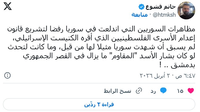 ويؤكد آخرون أن المظاهرات التي اندلعت في سوريا رفضا لقانون إعدام الأسرى الفلسطينيين، هي من حيث الحجم والانتشار ورسائلها المباشرة، مشهد غير مسبوق في التاريخ السوري الحديث، وأنها ما كانت لتظهر بهذا الوضوح لو أن بشار الأسد، الذي كان يُقدَّم بصفة "المقاوم"، لا يزال جالسا في القصر الجمهوري بدمشق.