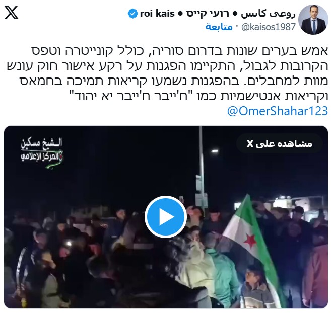 وعلق إسرائيليون على هذه المشاهد بالقول إن حجم مقاطع الفيديو الواردة من سوريا، التي توثق المظاهرات والتهديدات وحرق الأعلام الإسرائيلية، أمر غير مسبوق، ومخيف، مشيرين إلى تسجيل العديد من التحركات في مناطق سورية مختلفة.