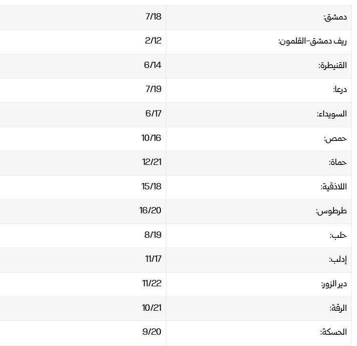 درجات الحرارة العظمى والصغرى في المحافظات السورية..