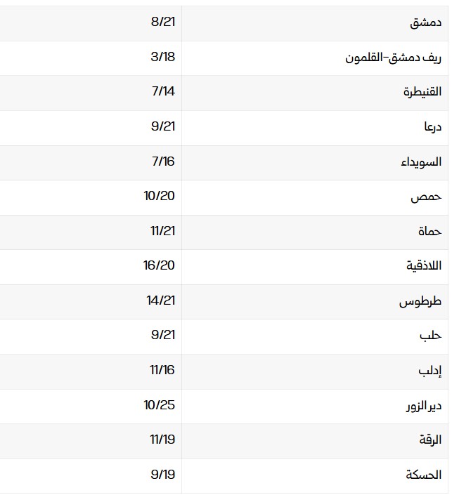 درجات الحرارة العظمى والصغرى في المحافظات السورية: